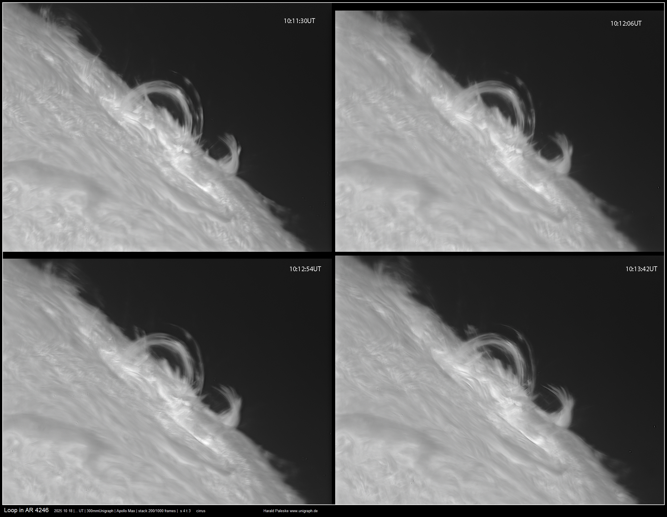 In Wolkenlücken konnte heute die wegdrehende AR 4246 beobachtet werden. Durch eine kalte Nordströmung war das Seeing extrem wechselhaft. Von grottenschlecht bis mittelmäßig war alles dabei. Die Animation zeigt dies dann auch. Trotz